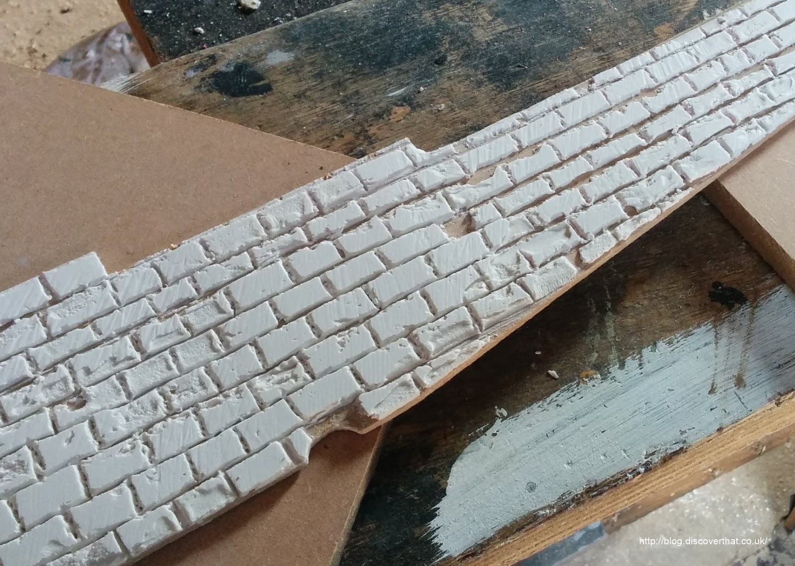 The other, used to make the walls of the long underpass, is made from drawing lines in to a thin layer of decorators filler. I've detailed this in other posts but I would not recommend it. It's only advantage is that I had the materials in my shed. It's difficult keeping it in place while working, it's difficult to make the brick shapes look right, its time consuming patching up the problems when it's dry!